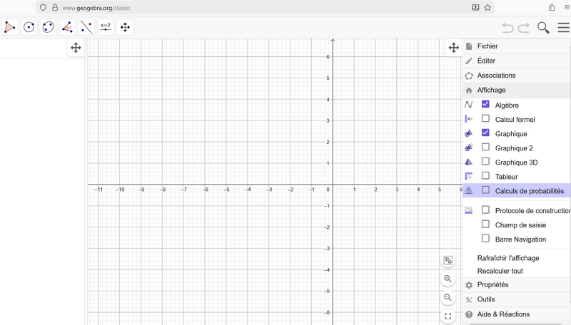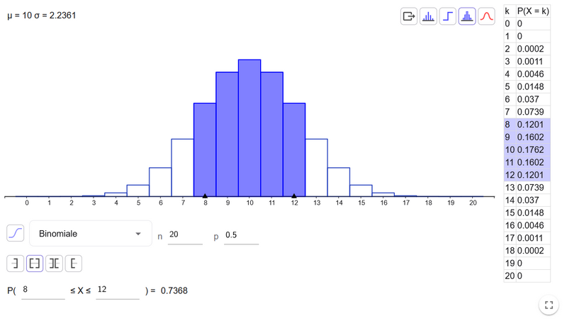 Commençons par selectionner le mode Probabilité et afficher la loi binomiale pour \( n=20 \) et \( p=0.5 \)